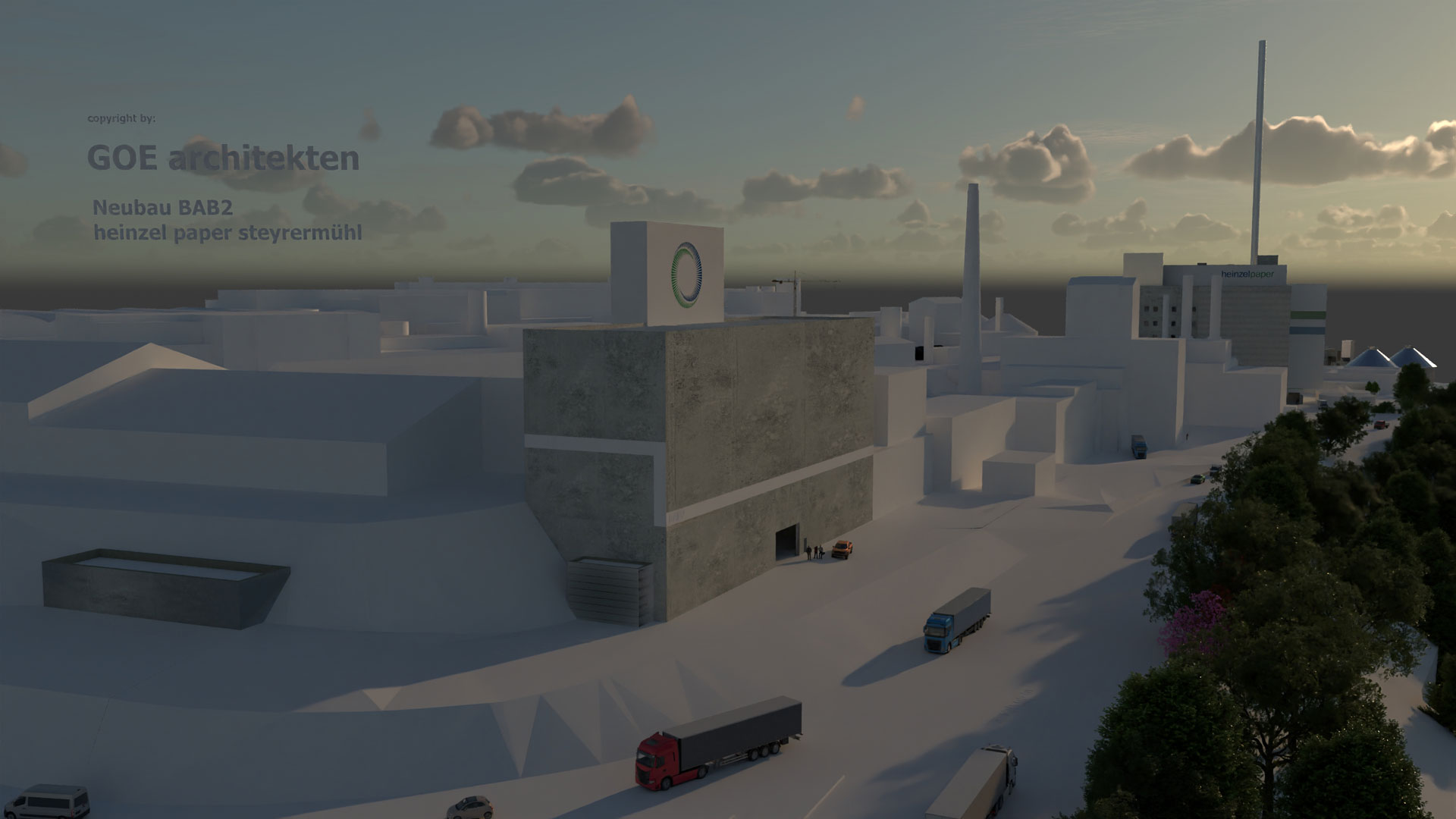 Entwurf eines massiven Sichtbetonensembles für Logistik & Holzlagerung am Standort Steyrermühl.